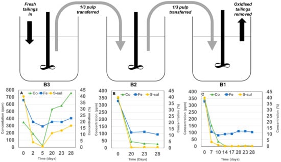 Bioleaching in each tank proceeded using the optimal conditions determined in Section 4.1 and following a standard BIOX® experiment. The sulphide concentrate material was placed in each tank and allowed to react for seven days and after this, material was manually transferred every three days from one tank to the next until the end of the experiment at day 28, as seen in Figure 9. As fresh material was placed into tank B3, sulphide content in the assayed solid was highest, with tank B2 intermediate and tank B1 containing the least. For the first 5 days (pre-transfer), sulphide oxidation progressed efficiently in tank B3, with a drop from 40% to 0.5% with 94% Co liberated, as seen in Figure 9A. On addition of new feed, an average of 13.75% sulphide-sulphur was present in the column suggesting that some oxidation of material occurred (i.e., 66%) with, on average 620 ppm Co remaining in the solid. This is greater than the measured bulk Co that went into the tanks (head assay: 350 ppm) implying that whilst sulphide oxidation is ongoing, Co may be precipitating in salts or even adsorbing to solid reaction products such as jarosite.