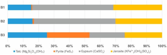 SEM investigations were undertaken to examine reaction products and showed that pyrite is present notably present in the original tailings composite, as seen in Figure S2, and concentrated significantly post-flotation (i.e., many bright phases are observable, as seen in Figure S2. This confirms bulk mineralogical observations, which suggest that the flotation reagents used are suitable. Much less pyrite is seen in the new rougher tails, but, it is still visible providing further evidence that flotation test work needs to be optimised (i.e., talc suppressed) in any further test work as Co is being lost and these new tails will still present an AMD risk (Figure S2). Residues collected from B3 show well-developed, large (up to 300 µm) tabular gypsum crystals are abundant, as seen in Figure S2, with minor cubic pyrite visible (approx. 10 µm, shown in Figure S2. In B2 residues larger gypsum crystals are observed and no pyrite. In the B1 final residue, the reaction products gypsum and jarosite are abundant.