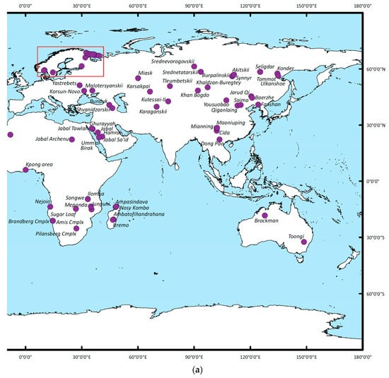 Figure 2. (a) Summary of the global distribution of major REE resources associated with alkali igneous deposits (n = 100, for 22 deposits no specific REE mineralogy is reported) [11,28] for the eastern hemisphere. The eastern hemisphere is shown here. The REE-mineral associations and their chemical characteristics are discussed in the main text. The area outlined by the red box can be viewed at a smaller scale in the Supplementary Information. (b) Summary of the global distribution of major REE resources associated with alkali igneous deposits (n = 100, for 22 deposits no specific REE mineralogy is reported) [11,28] for the western hemisphere. The REE-mineral associations and their chemical characteristics are discussed in the main text.