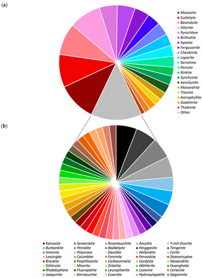 Figure 3. A total of 60 REE-bearing minerals and mineral groups have been reported for the deposits summarized in Figure 2 [28]. Upper panel (a) graphic illustrating the relative presence of the top 20 REE-bearing minerals and mineral groups found in the deposits summarized in Table 1. Monazite group minerals are the most commonly occurring REE-bearing minerals, present in 39 of the deposits (Table 1) with minerals of the eudialyte, bastnäsite, and allanite groups found in 33, 32, and 32 of the reported deposits respectively. Gadolinite and thalenite, the 2 least common occurring of the top 20, are reported in 6 and 4 deposits respectively. Lower panel (b) graphic summarizing the relative occurrence of the other 40 REE-bearing minerals reported to be associated with the deposits summarized in Table 1. 33 of these are reported only once. Members of the kainosite, samarskite, rosenbuschite, and ancylite groups are reported three times, with Y-rich fluorite, burbankite, and yttrialite each reported twice.
