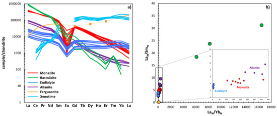 Figure 4. (a) Chondrite normalized (N) REE profiles for representative examples of minerals of the monazite, bastnäsite, eudialyte, and allanite groups illustrating their broadly LREE enriched nature, and minerals of the fergusonite and xenotime groups, illustrating their broadly HREE-enriched nature. (b) Degree of LREE enrichment highlighted, particularly for bastnäsite-(Ce) with values of >6000 for LREE/HREE signatures [37,38,39,40,41]. The y-axis shows LaN/SmN where Sm was selected to represent the middle rare earths. Normalization values reported in Sun and McDonough [42].
