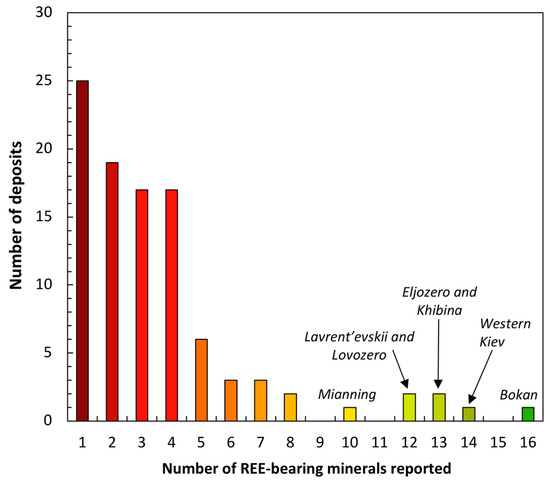 Figure 5. Graphic summarizing the occurrence of REE-bearing minerals of economic interest that have been reported in the deposits illustrated in Figure 2 [28]. Twenty-one of the deposits report the occurrence of ≥5 REE minerals, 34 contain three or four REE minerals, and 44 of the deposits report only one or two REE minerals.
