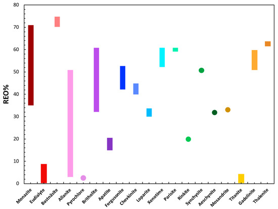 Figure 6 summarizes the total REO% (total rare earth oxide) associated with the most commonly occurring REE-bearing phases in the deposits shown in Figure 2. Minerals of the bastnäsite, monazite, and xenotime groups are shown to contain some of the highest percentages of total REOs. Minerals of the bastnäsite group exhibit the highest REO abundances up to 75 wt %, with minerals of the monazite group up to 71 wt % but with an acknowledged range down to lower abundances at 35 wt % [49]. By comparison, minerals of the xenotime group contain a relatively short range of REO% abundances from 52% to 61% although this is primarily accounted for by the HREE and Y. Other high total REO% phases include thalenite-(Y) (up to 64 wt %), members of the parasite group and members of the britholite group both up to 50 wt % and members of the gadolinite group up to 60 wt % (Figure 6).