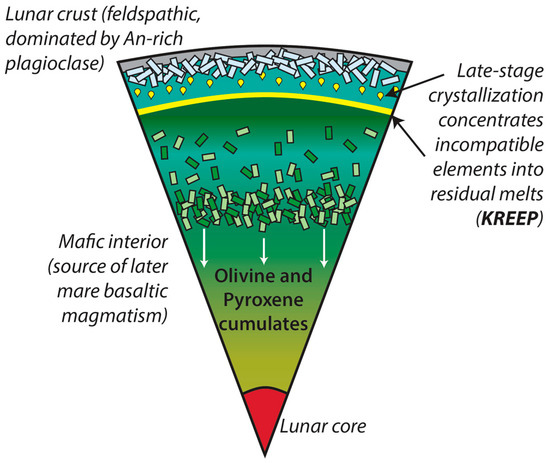Figure 7. Simplified model of lunar magma ocean solidification where by early crystallization is characterized by olivine and pyroxene which settle towards the lunar interior [19,62,63,64]. When plagioclase becomes a liquidus phase, it buoyantly rises to the top of the cooling LMO to form a primary, anorthositic, flotation crust. Incompatible elements in these major rock forming minerals, e.g., the REEs, are concentrated in late-stage residual liquids and form the KREEP reservoir.