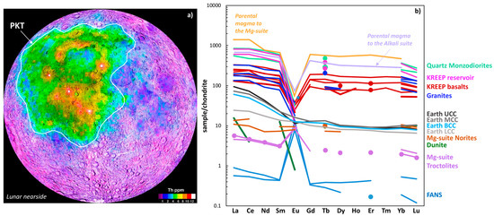 Figure 9. (a) Lunar thorium (Th) map of the nearside [66]. Relatively high concentrations of KREEP-rich lithologies are associated with the occurrence of heat-producing elements (e.g., Th and U) with the area outlined known as the Procellerum KREEP Terrane (or PKT). (b) Summary of chondrite-normalized REE signatures for lunar lithologies, compared to Earth’s bulk crustal reservoirs [19,23] (UCC: upper continental crust, MCC: middle continental crust; LCC: lower continental crust; BCC: bulk continental crust). Normalization values reported in Sun and McDonough [42].