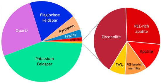 Ore deposits associated with chemically evolved igneous rock suites have been the intense focus of research over the past several decades [1,2,3,4,5,6,7,8,9,10,11,12,13,14]. Magmatic-associated mineral deposits are mineralogically and chemically diverse, occur in a range of geological settings, and have long been the target of the mineral industry. They host a wide array of precious and semi-precious metals including tin (Sn), tungsten (W), lithium (Li), molybdenum (Mo), bismuth (Bi), iron (Fe), copper (Cu), and silver (Ag), and the rare earth elements (REEs) which includes the lanthanide series (Lanthanum (La) to lutetium (Lu) in addition to scandium (Sc) and yttrium (Y)).