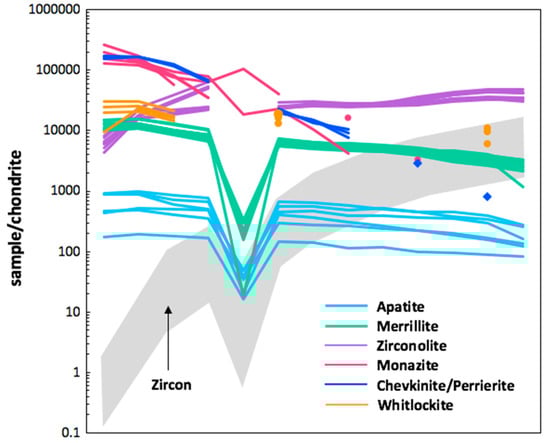 Figure 11. Chondrite normalized (N) REE profiles for lunar apatite, merrillite, zirconolite, monazite, chevkinite-perrierite, whitlockite, and zircon [42,83,87,88,89,90]. The majority of the phases shown are relatively LREE-enriched with zirconolite (and zircon) the only phases exhibiting relative HREE enrichment.