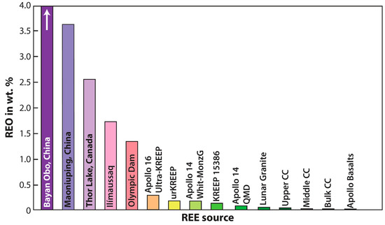 For a deposit to be considered a resource, and economically mined as an ore, the presence of that targeted element or elements and their host mineral(s) must first be concentrated through one or more differentiation processes. These concentrations are typically higher than average crust [107]. Figure 12 compares the total REO (in wt %) present in lunar lithologies, including lunar granites and the urKREEP reservoir, to several of Earth’s most significant REE-related deposits (see also, Figure 2). As shown, no currently sampled lunar lithology can be considered a resource with even the urKREEP (and a high KREEP-bearing Apollo 16 sample) containing <0.5 wt % REOs. This is in contrast to the REE deposit at Bayan Obo, currently the world’s most significant producer of REEs estimated at >4 wt % REOs. Not shown on Figure 12 is the REE deposit at Mt. Weld, Australia where 9.7 wt % of REOs is estimated.