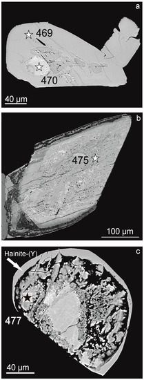 Morphology of titanosilicates from the nepheline syenite pegmatite, Sakharjok massif, Kola Peninsula. Backscattered electron images. Asterisks indicate point of microprobe analyses; analyses numbers correspond to Table 2. (a)—“eye-like”titanosilicate (an. 470), hainite-(Y) (an. 469), (b)—“porous” (an. 475), (c)—“loose” titanosilicate (an. 477).