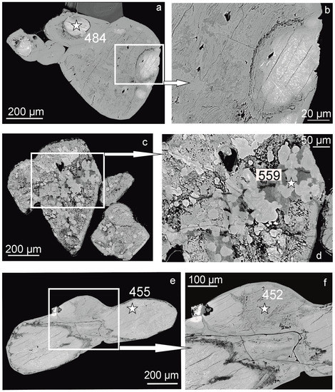 Morphology of titanosilicates from the nepheline syenite pegmatite, Sakharjok massif, Kola Peninsula. SEM, BSE images. Arrows to the right indicate enlarged images of the respective squared areas. Asterisks indicate point of microprobe analyses, analyses numbers correspond to Table 2. (a,b)—“eye-like” (an. 484), (c,d)—homogenous” (an. 559), (e)—“porous” (an. 455), and (f)—“layered” (an. 452), titanosilicates.