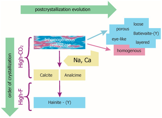 Figure 4 shows the temporal relationships between minerals and mineral phases, in addition to the spatial relationships shown in Figure 1 and Figure 2. Statistics data are consistent with geochemical indicators in showing batievaite-(Y) and hainite-(Y) to be minerals of different generations (Figure 4) and batievaite-(Y) to be prior to hainite-(Y).