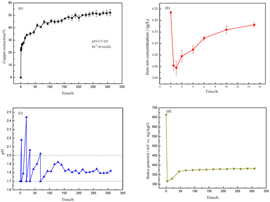Results of chalcocite acidic ferric sulfate leaching (pH = 1.7~2.0, C(Fe3+) = 0.1 mol/L): (a) Copper extraction at different leaching times; (b) Iron ion concentration in the first 15 h; (c) Variation of pH value; (d) Variations of redox potential.