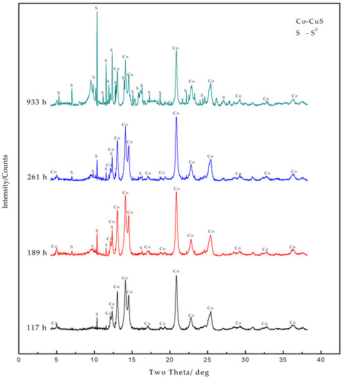 The results shown in Figure 4 suggest that no new phase appeared in the second stage of chalcocite leaching, where the peak intensity of CuS was increasingly weaker, whilst the peak intensity of elemental sulfur was increasingly stronger as the leaching continued. After leaching for 933 h, the main phase was elemental sulfur and only a few CuS existed.
