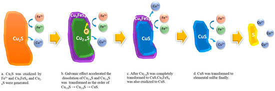 It should be noting that the disappearance of those intermediates was in the order of Cu1.8S → Cu7.2S4 → Cu8S5 → Cu5FeS4 → CuS, according to Figure 3 and Figure 4. In addition, it has been reported by many researchers that there exists a galvanic effect between different semiconductor minerals when they are leached [49,50,51]. In the first stage of chalcocite leaching, several copper sulfide minerals appeared; the other potentials of these minerals were different and there existed a galvanic effect between them. The other potentials of these minerals were in the following order: Cu2S < Cu1.8S < Cu1.6S < Cu5FeS4 < CuS. Hence, it can be speculated that the galvanic effect between Cu5FeS4 and Cu2−xS accelerated the dissolution of Cu2S and Cu2−xS, and when Cu2−xS was completely transformed to CuS, a galvanic effect between Cu5FeS4 and CuS accelerated the dissolution of Cu5FeS4, then all the intermediates were transformed to CuS.