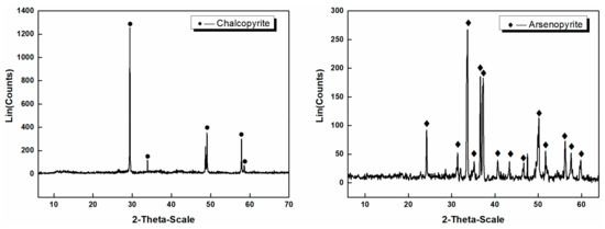 Natural arsenopyrite and chalcopyrite specimens were provided from Guangdong and Yunnan Provinces in China, respectively. Dry grinding and then screening were used for the samples to collect the −74 μm to 38 μm particle size fraction for flotation tests. The purities of chalcopyrite and arsenopyrite samples were 96% and 95%, respectively, as shown by mineralogical compositions. These samples were of high purity, as confirmed by X-ray diffraction analysis (Figure 1). A polyethylene bag was used to seal all the samples. Then, these samples were stored in a freezer to reduce the surface oxidation.