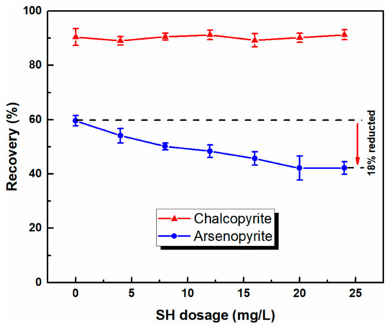 Flotation recovery of chalcopyrite and arsenopyrite as an SH dosage function (CSBX = 1.0 × 10−4 mol/L, 2#oil = 15 mg/L and pH 9).