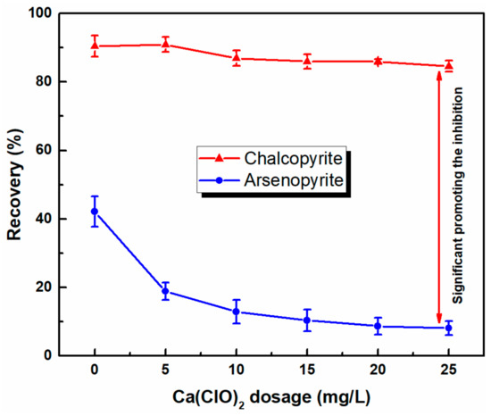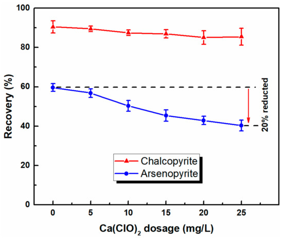 Flotation recovery of chalcopyrite and arsenopyrite as a Ca(ClO)2 dosage function (CSBX = 1.0 × 10−4 mol/L, 2#oil = 15 mg/L and pH 9).