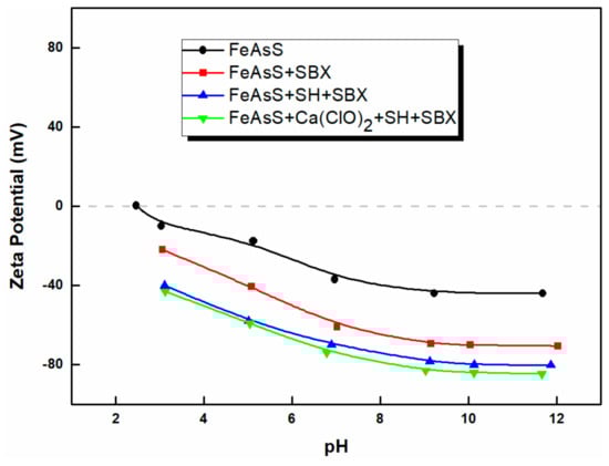 Figure 7 shows that SBX rendered the zeta potential of arsenopyrite more negatively. When xanthate ions were oxidized to dixanthogen on the arsenopyrite surface, negative zeta potential increased [36]. With SH, the zeta potential of arsenopyrite decreased sharply over the entire pH range. This significant decrement was related to the adsorption of SH, which possessed a molecular structure containing carboxylic acid functional groups [37]. After adding the Ca(ClO)2, the zeta potential of arsenopyrite become more negative at pH values higher than 5, thereby indicating that Ca(ClO)2 was strongly adsorbed on arsenopyrite.