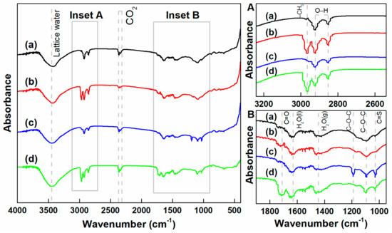 The FTIR spectra of chalcopyrite before and after treatment with reagents obtained in the wavenumber range of 4000–400 cm−1 are presented in Figure 8. Compared with the infrared spectrum of native chalcopyrite (Spectrum [a]), Spectrum (b) exhibited weak peaks at 2960.04 and 1711.39 cm−1. The peak at 2960.04 cm−1 belonged to the asymmetrical stretching vibrations of alkyl group –CH3 (inset A of Figure 8). The peak at approximately 1711.39 cm−1 (inset B of Figure 8) was assigned to the stretching vibrations of the C=O group. Absorption occurred when SH interacted with chalcopyrite. Compared with spectra (a) and (c) between 1200 and 800 cm−1 (inset B of Figure 8), several characteristic peaks occurred at around 1197.42, 1093, and 1018.16 cm−1. According to a literature [38], these peaks are the characteristic peaks of cupric xanthate. The peaks at 1197.42 and 1093 cm−1 corresponded to the C–O–C asymmetric and symmetric stretching vibrations [38]. Meanwhile, the peak at 1018.16 cm−1 was attributed to the C=S stretching vibration [39]. With Ca(ClO)2, SH, and SBX (Spectrum [d]), the characteristic peaks of SBX and SH coexisted, thereby suggesting that SBX and SH were adsorbed simultaneously on the chalcopyrite surface. The interaction between chalcopyrite and SBX or SH slightly affected Ca(ClO)2. This finding was consistent with the flotation results.