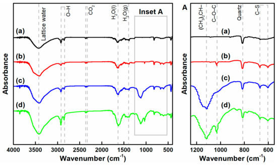 FTIR spectra of arsenopyrite before and after conditioning in the aqueous solutions of reagents: (a) Arsenopyrite; (b) Arsenopyrite + SH; (c) Arsenopyrite + SBX; and (d) Arsenopyrite + Ca(ClO)2 + SH + SBX.