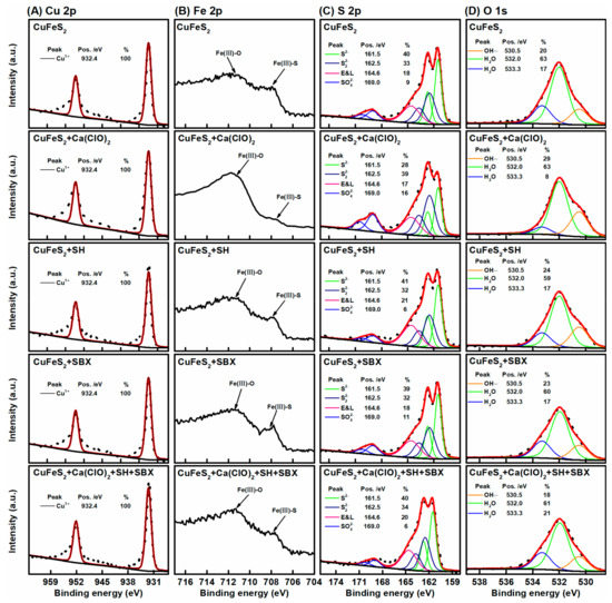 The S 2p spectra (Figure 10C) of untreated chalcopyrite consisted of three major doublets. The binding energy peak centered at 161.5 eV was attributed to the monosulfide (S2−) [46], the peak located at 162.5 eV conformed to disulfide (S22−) [47], and the one at 169.0 eV matched the sulfate species [44]. In addition to the three S 2p doublets, another broad peak (FWHM = 2.3) was observed at 164.6 eV, which was previously related to energy loss [48,49]. Under the condition of SH, SBX, and mixed reagents, the proportion of S2− remained at approximately 40%, whereas that of S22− nearly remained unchanged at approximately 32%. With SH, the proportion of SO42− slightly decreased, whereas that of SO42− was unchanged. Meanwhile, with Ca(ClO)2, the S2− content decreased to 28%; conversely, the S22− and SO42− increased to 39% and 16%, respectively. In the presence of SH, the content of every component on the S 2p spectra was negligibly different, indicating that the adsorption of SH can reduce the oxidation of chalcopyrite surface caused by Ca(ClO)2.