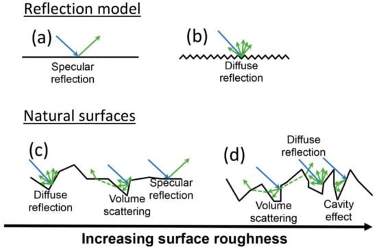 Schematic diagram of interaction of light with a smooth surface (a) that displays specular reflection and a rough surface (b) that displays diffuse reflection. In natural surfaces, increasing surface roughness decreases specular reflection (c) and promotes diffuse reflection, volume scattering, and the cavity effect (d), which all reduce the spectral contrast.