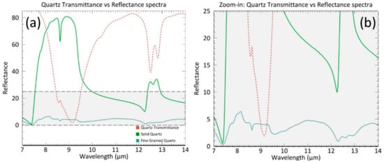 (a) The effect of transmittance in quartz (red spectrum) on the reflectance spectrum. The green spectrum represents a quartz spectrum that has not been influenced by transmittance. The blue spectrum is a quartz spectrum of a fine-grained, particulate quartz sample (<60 µm) that is significantly affected by transmittance bands [16]. (b), a subset of (a), shows a lowered spectral reflectance in bands that are most influenced by low transmittance. Spectra are from Johns Hopkins University (JHU) and can be found in the ASTER spectral library in ENVI [30,31].