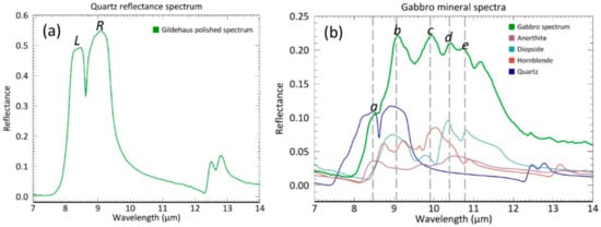 (a) An example of a quartz reflectance spectrum with the Gildehaus polished spectrum. (b) Gabbro polished reflectance spectra, including the spectra of the minerals that contribute to the shape of the Gabbro spectral signature. Mineral spectra are from Johns Hopkins University (JHU) and can be found in the ASTER spectral library in ENVI [30].