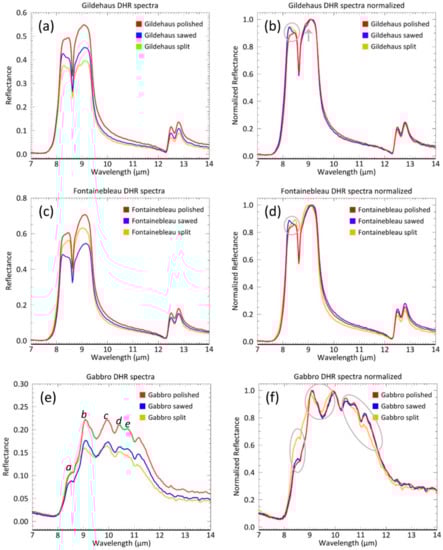 The Gabbro DHR spectra shown in Figure 4e and f demonstrate a clear spectral contrast between the polished surface that has the highest reflectance and the sawed and split surfaces, which have a lower, but comparable, reflectance (Table 2). Hence, the overall order is the same as in the Gildehaus sandstone. Furthermore, the shape of the spectral features of the polished and the sawed surface correspond well, but the shape of the spectral features of the split surface is different from the other two surfaces. For the split surface, the peaks b (9 µm) and c (9.8 µm) shift to lower wavelengths by ~0.2 µm. Other observed changes are a lower reflectance for the right side of the reflectance feature (e and d, 11.2 µm) and the bulge of the broad spectral feature at a (8.5 µm), which increases in reflectance compared to both other surfaces.