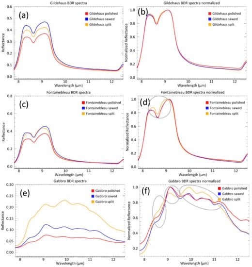 The Fontainebleau DHR spectra in Figure 4c,d also show clear differences in spectral contrast for all spectral features. However, there are some distinct differences in comparison to the Gildehaus spectral features. First, the order of the three surfaces in their spectral contrast is different: the polished surface has the highest contrast; however, the split surface shows an intermediate spectral contrast in between the polished and the sawed surface (Table 2). Secondly, the left lobe of the reststrahlen quartz feature of the Fontainebleau split spectrum has a different orientation (reflectance maximum at longer wavelength) compared to the Gildehaus sandstone (reflectance maximum at shorter wavelengths).