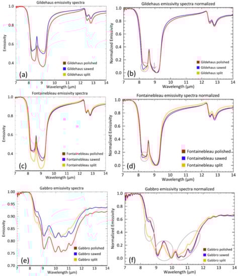 Mean emissivity spectra and normalized mean emissivity spectra of the Gildehaus (a,b), Fontainebleau (c,d), and Gabbro (e,f) emissivity measurements. Circles and arrow indicate spectral shape changes.