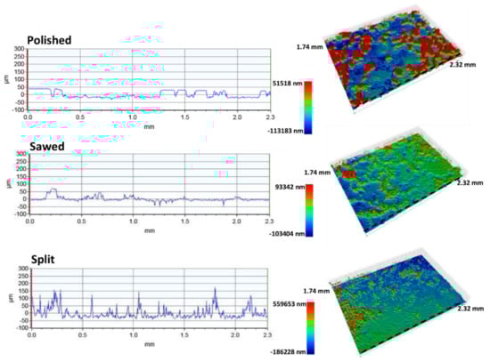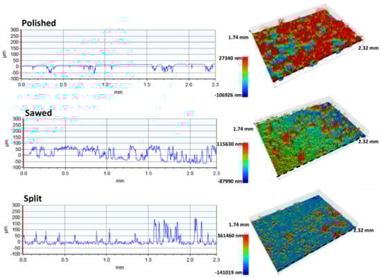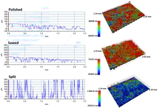 The surface roughness analyses of the Gabbro polished and sawed surface show that they have an almost identical surface topography (Figure 10); the only difference is that the flat tops have been smoothed slightly as a result of polishing. Their roughness parameters are comparable, with an identical Ra of 28.9 and a Rq of 35.1 and 34.3 for the sawed and the polished surfaces, respectively (Table 5). The surface roughness profiles and 3D models confirm this. The split surface displays a significant surface topography with a Ra of 144.1 and a Rq of 200.7 and a distinct profile with peaks partially extending outside of the measuring range set for the surfaces.