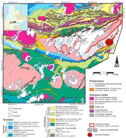 - Leclerc, F.; Harris, L.B.; Bédard, J.H.; Van Breemen, O.; Goulet, N. Structural and stratigraphic controls on magmatic, volcanogenic, and shear zone-hosted mineralization in the Chapais-Chibougamau mining camp, Northeastern Abitibi, Canada. Econ. Geol. 2012, 107, 963–989. [Google Scholar] [CrossRef]