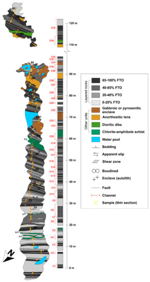 Detailed geological map of the northern part of the trench 19 + 50E, Lac Doré property. The 122-m-long transect line encompasses the P1 and P2 units of the Layered Series. FTO, Fe-Ti oxides. Modified after Arguin and Girard [45].