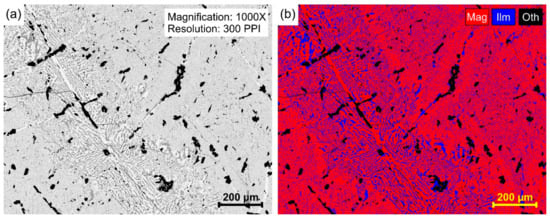 An example of (a) a high-resolution backscattered electron image (1000X) that was acquired on a Zeiss EVO-MA15 SEM, and (b) the corresponding false-color image showing the distribution of ilmenite exsolutions in decomposed titanomagnetitess. See text for details. Ilm, ilmenite; Mag, magnetite; Oth, others.
