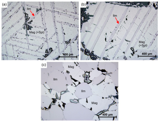 As mentioned in the introduction, titanomagnetite is an intermediate between the end-members of the magnetite-ulvöspinelss series. In this paper, as well as in many others (e.g., [15,16,48]), the term “titanomagnetite” is used for magnetite containing titaniferous exsolutions that result from the decomposition of the original solid solution.