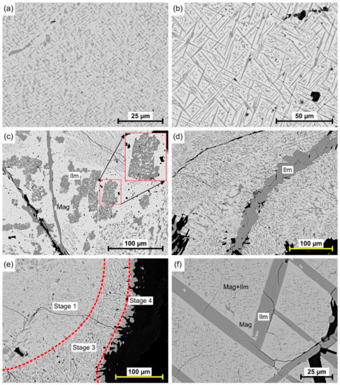 Stage 3: Ilmenite-E2 is present as patchy or vermicular intergrowths that mostly range from a few to several tens of microns in size (Figure 5c,d). At this more advanced stage of migration, ilmenite commonly contains very small (<10 µm) blebs of magnetite (Figure 5c). The term “composite intergrowth” has been used by Von Gruenewaldt et al. [15] to define this exsolution feature in the Upper Zone of the Bushveld Complex. Contiguous irregular areas of vermicular intergrowths showing either preferential orientations or, to a lesser extent, radiating arrangements (referred to as eutectoid-like intergrowths in Reynolds [50]) have been observed in many samples. Ilmenite pseudomorphous after cloth-like texture are sporadically preserved between patchy and vermicular intergrowths; however, in most cases, intensive diffusion had led to the formation of relatively large areas of exsolution-free magnetite (Figure 5c). Intergrowths of Stage 3 are generally better developed near grain boundaries and fractures; however, they also commonly cover the entire grain area. It is possible, however, that this latter observation represents a section cut close to a grain margin.
