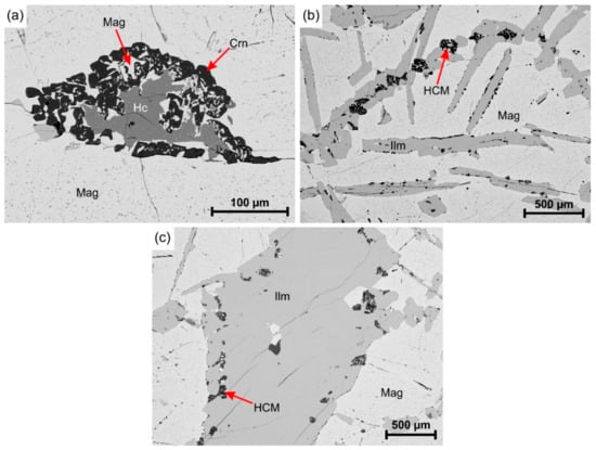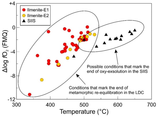 Intergrowths of magnetite and ulvöspinel in mafic intrusions are typically represented by a cloth-like texture (e.g., [15,20,21,22]). Although cloth-textured intergrowths were found in titanomagnetite of the LDC, the bulk of the ulvöspinel appears to be completely transformed to ilmenite, as suggested by a group of very minute exsolutions causing patchy optical anisotropy in conformity with the {111} lattice planes of the magnetite structure. This low-temperature ilmenite, i.e., proto-ilmenite in previous studies (e.g., [15,21,22]), would result from the great susceptibility of ulvöspinel to be oxidized. Ilmenite formed through this process will be referred to as Ilmenite-E2 in the text below.