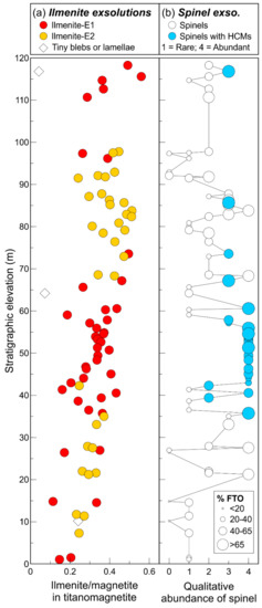 The relationships between the stratigraphic elevation, the abundance and the distribution of ilmenite, and Al-spinel exsolutions: (a) the ilmenite/magnetite ratio in titanomagnetite that was measured from backscattered images using the method that is described in Section 3.3; (b) Al-spinel abundance given as a function of four qualitative classes (from 1 = rare to 4 = abundant). The distribution of exsolutions is expressed by different symbol shapes and colours (see the legends). The circle sizes in the diagram (b) represent the abundance of FTO (Fe-Ti oxides) in rocks. HCMs, hercynite–corundum–magnetite intergrowths.