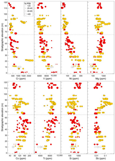 The relationships between the stratigraphic elevation and eight of the elements that were determined by LA-ICP-MS to be in titanomagnetite (Cr, V, Ni, Mg, Co, Ti, Si, and Sb). The symbol shapes and colours are as in Figure 8a. The circle sizes represent the abundance of FTO (Fe-Ti oxides) in rocks. The dashed line corresponds to the 65-meter-height level (see text for details).