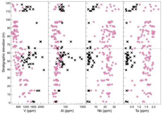 The relationships between the stratigraphic elevation and four (4) of the elements that were determined by LA-ICP-MS to be in ilmenite (V, Al, Nb, and Ta). The pink filled circles represent the population of ilmenite that was crystallized from the magma, whereas the black crosses represent Ilmenite-E1. The dashed line corresponds to the 65-meter-height level (see text for details).