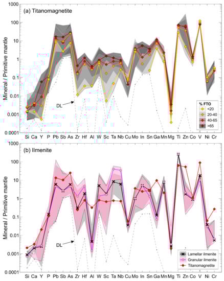 The mantle-normalized trace element compositions of (a) titanomagnetite and (b) ilmenite as determined by LA-ICP-MS. The patterns—represented by symbols and thick lines—correspond to the overall-average values, whereas the fields correspond to the distribution of sample-average values. The diamond and line colours in the diagram “a” represent the abundance of FTO (Fe-Ti oxides) in rocks. The average composition of titanomagnetite has been added to the diagram (b) for comparative purposes. The terms “granular” and “lamellar” have respectively been used in the legend of the diagram (b) to designate ilmenite that is derived from primary crystallization and Ilmenite-E1. The elements (excluding As, Sb, and In) are plotted in order of increasing compatibility (from left to right) with magnetite according to Dare et al. [47]. Arsenic, Sb, and In were added to the compatibility order considering, to the best of our knowledge, behavior similarities. The normalizing mantle values are from McDonough and Sun [60]. DL, detection limits.