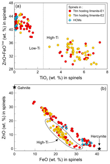 Binary diagrams of the composition of Al-spinel exsolutions in titanomagnetite as determined by EDS: (a) TiO2 versus ZnO + FeOTotal; (b) FeO versus ZnO. The dashed line in the diagram (a) corresponds to the limit between the high- and low-Ti series. The composition of the end-members hercynite and gahnite have been added to the diagram (b). HCMs, hercynite-corundum-magnetite intergrowths; Tmt, titanomagnetite.