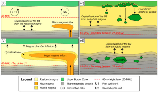 In response to its highly compatible behavior, Cr in titanomagnetite is commonly used to identify events of primitive magma recharge (e.g., [54,56]). The Cr trend that is shown in Figure 9 is defined by several abrupt up-sequence increases, each followed by a rapid decrease. These reversals in Cr likely result from successive episodes of compatible element replenishment, whether via (1) reinjections of fresh, more primitive magma (e.g., [54,55,57]), or (2) convective overturns that have brought less differentiated liquid into the crystallization zone [58,59]. The replenishment event at the ~65 m height level in Figure 9 is not only highlighted by an abrupt reversal in Cr, but also in Mg, Co, Ti, and Si. Above this critical level, the slope changes occurring in the Mg, Co, and Ti diagrams indicate that these elements became suddenly more compatible. The more frequent observation of metamorphic mineral assemblages that are produced via the transformation of clinopyroxene in the upper half of the section suggests that this behavior change results from higher crystallizing proportions of pyroxene than in the underlying sequence. As will be discussed later, both reversals and slope changes that are related to the 65-m-height level (65-MHL) are indicative of a relatively major influx of fresh magma.