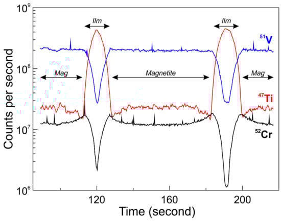 Accordingly, between 10 and 35 wt. % ilmenite was needed to be added to correct the Fe calibration value for the titanomagnetite. The synthetic basalt glass GSE-1G supplied by the United States Geological Survey was used to calibrate all of the measured isotopes. In order to test the accuracy of the calibration, we also analyzed an in-house monitor known as BC-28, which is a natural magnetite from the lowermost titanomagnetite layer of the Bushveld Complex. According to the list of possible isotopic interferences given by Dare et al. [47], 52Cr and 53Cr could cause argide (40Ar) interferences on 92Zr and 93Nb, respectively, whereas 47Ti could cause oxide (16O) interferences on 63Cu. Although Ti is present at the tens of percent level and Cr is present at the hundreds of ppm level in the LDC iron oxides, we did not observe any correlations between Cr and Zr or Nb, nor between Ti and Cu, suggesting that the argide and oxide interferences were negligible. For this study, 346 LA-ICP-MS analyses of titanomagnetite and ilmenite were done. The complete data set, including detection limits and trace element compositions, and values for reference materials are presented in Tables S3 and S4, respectively.