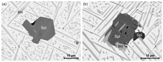 Three main types of Al-spinel exsolution have been observed in our samples (listed in decreasing order of abundance): (1) granular Al-spinel that occurs within the magnetite matrix (Figure 6b); (2) granular Al-spinel that forms rectilinear alignments (Al-spinel strings) within or along lamellae of Ilmenite-E1 (Figure 6c); and (3) thin disc-shaped Al-spinel arranged along the {100} directions of magnetite (Figure 6d). These exsolutions mostly range from 5 to 25 µm in size. They tend to predominantly occupy the core of titanomagnetite (Figure 6e), that indicates that the dissolved quantities of Al, Zn, and, to a lesser extent, Mg, were especially high in the early stage of titanomagnetite crystallization (see also Ramdohr [7]). As will be discussed later, the absence or reduced size of Al-spinels in the immediate vicinity of Ilmenite-E1 lamellae (Figure 6f) suggests that Al and Zn have diffused to form zinciferous hercynite and/or gahnite at the interface between ilmenite and magnetite. Similar features as those mentioned above have been observed and documented for pleonaste exsolutions occurring in titanomagnetite from other mafic intrusive rocks (e.g., [15,22,27,29,30,31]).