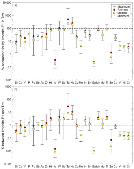 The composition of ilmenite exsolutions is compared to the composition of ilmenite that derives from primary crystallization in Figure 10 and Figure 11b. Given that Ilmenite-E2 is generally too small to be analyzed by LA-ICP-MS, the composition of exsolutions was only determined from thick lamellae of Ilmenite-E1, while ensuring that Al-spinel exsolutions were avoided during laser ablation. As expressed in Figure 10, lamellar ilmenite is clearly enriched in V and Al, but depleted in Nb and Ta relative to the primary grains. This is not surprising given that V3+ and Al3+ are more compatible with the spinel structure during primary crystallization, whereas high-field-strength elements (HFSEs), such as Nb and Ta, enter more easily into the ilmenite through 4+ cation substitution (e.g., [66]). Furthermore, the normalized average compositions that are given in Figure 11b indicate that Ilmenite-E1 tends to be also enriched in W, Sn, and Ga, but depleted in other HFSEs, such as Zr and Hf, relative to primary ilmenite. The concentrations of HFSEs, as well as those of W, Sc, Mg, Mn, and obviously Ti, are higher in ilmenite compared to titanomagnetite, which concentrates most of the other elements (Figure 11b).