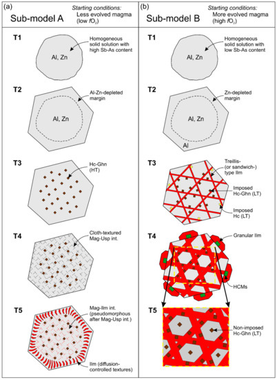 These authors also suggested that increasing degrees of diffusion during this “oxy-exsolution” process result in a systematic progression of ilmenite exsolution textures from: (1) the trellis-type texture of thin ilmenite lamellae in all sets of {111} lattice planes of magnetite; through (2) the sandwich-type texture of thick ilmenite lamellae predominantly in one set of {111} planes; (3) magnetite-hosted granular exsolutions; to (4) external granular exsolutions. Although oxy-exsolution is the most-accepted mechanism for the formation of ilmenite in magnetite (e.g., [15,16,22,24]), recent studies also propose alternative mechanisms, including direct exsolution from cation-deficient titanomagnetitess and inter-oxide re-equilibration between titanomagnetitess and ilmenite-hematitess [25,26].