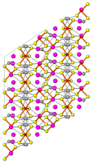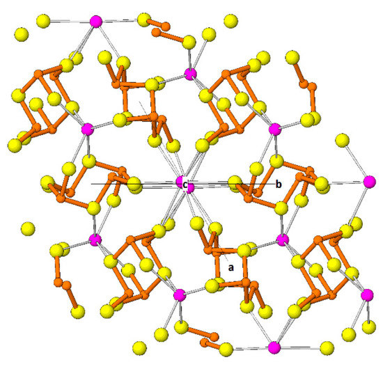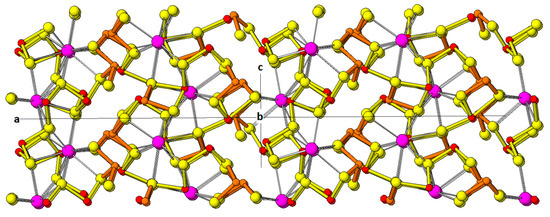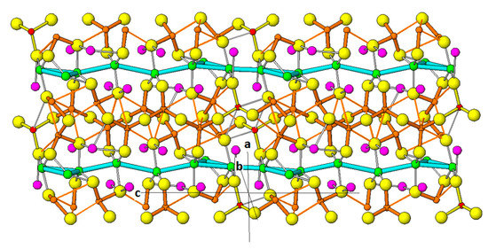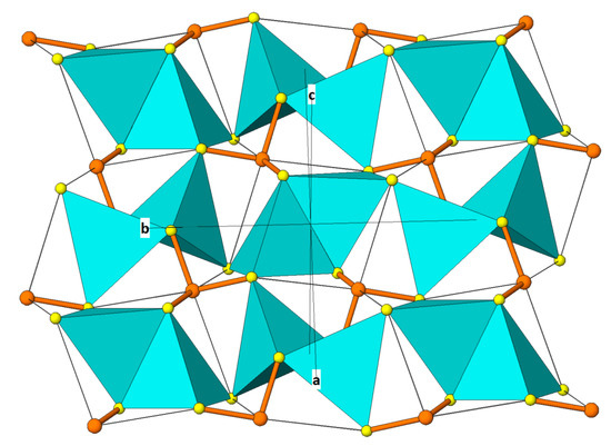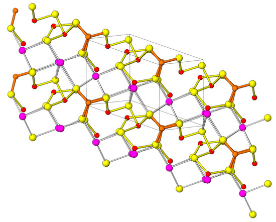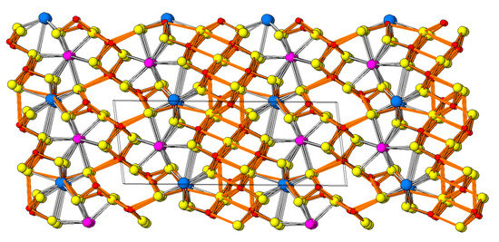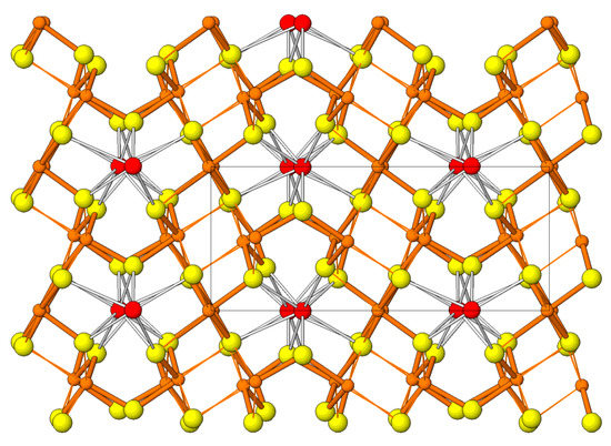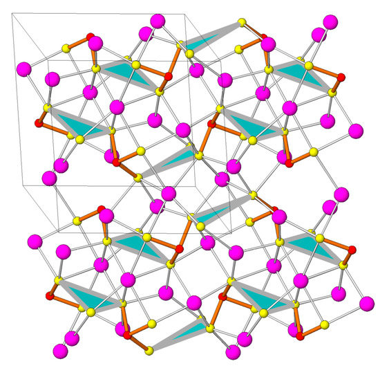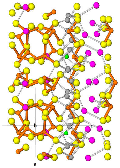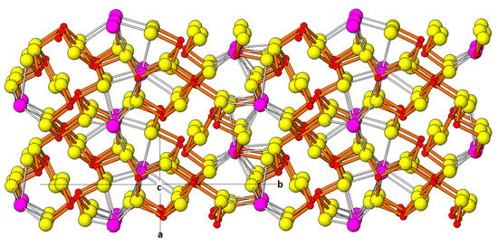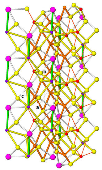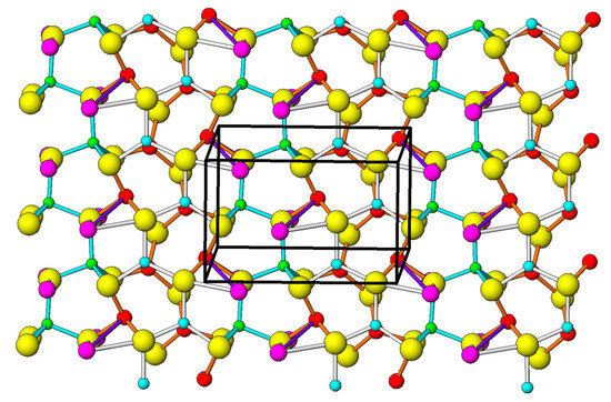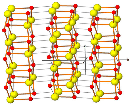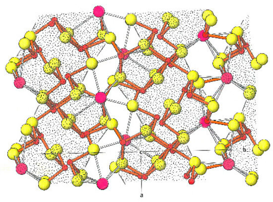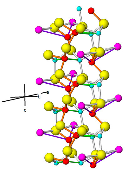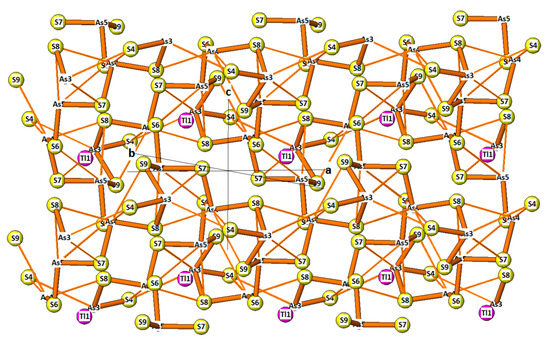 Using the data of [10], lorándite is monoclinic, space group P21/a, a 12.296 Å, b 11.313 Å, c 6.114 Å, β 104.21°. The AsS3 pyramids with short bonds (2.20–2.33 Å; Balić-Žunić et al. [10]) are interconnected via common sulfur atoms into spiral [010] chains. The periodicity of spirals determines the b parameter (11.313 Å); there are four pyramids in the b period. Each spiral builds a four-sided rod, with As atoms on its edges and with all lone electron pairs oriented outwards, out of the body of the rod (Figure 2). One of the longer As–S interactions (3.191–3.323 Å), opposed to the short ones, completes the edge of the rod, whereas the other two long interactions (3.953 Å and longer), which extend to sulfurs of two adjacent rods, bridge the inter-rod space.