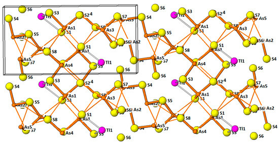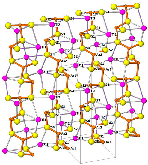 - Fleet, M.E. The crystal structure and bonding of lorandite, Tl2As2S4. Z. Kristallogr. 1973, 138, 147–160. [Google Scholar] [CrossRef]